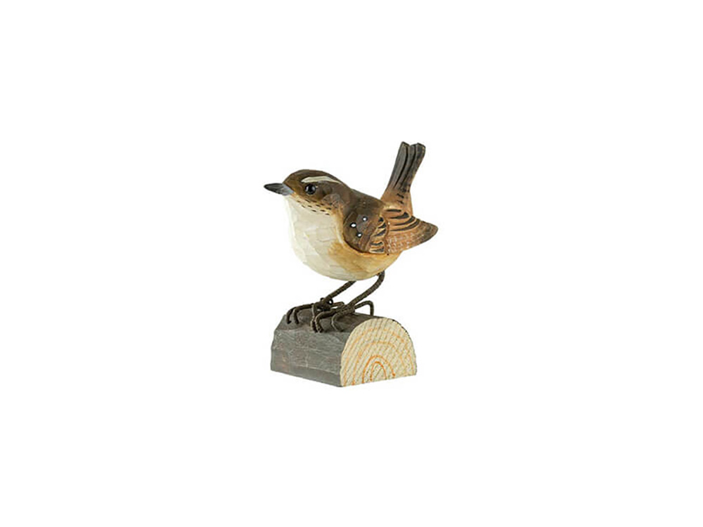 Troglodyte en bois à conception traditionnelle. L’oiseau est représenté grandeur nature et peint avec une peinture écologique.