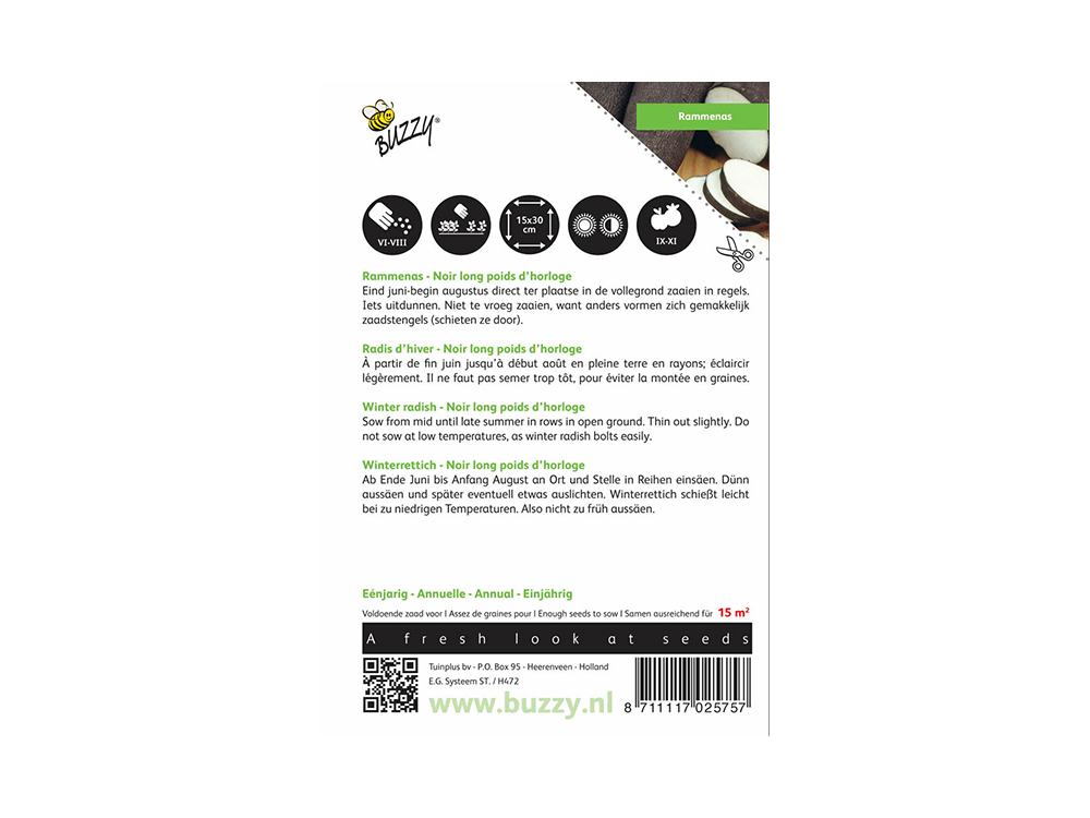 Semez le radis en juin-juillet directement dans le jardin, en rangées avec un espacement de 25 cm. Après l’émergence, éclaircez les plantes jusqu’à ce qu’il y ait 20 cm entre les plantes restantes. Récolte : de septembre à octobre.