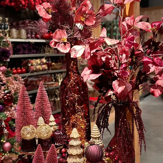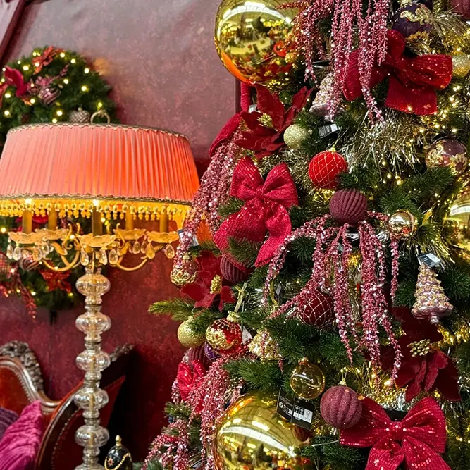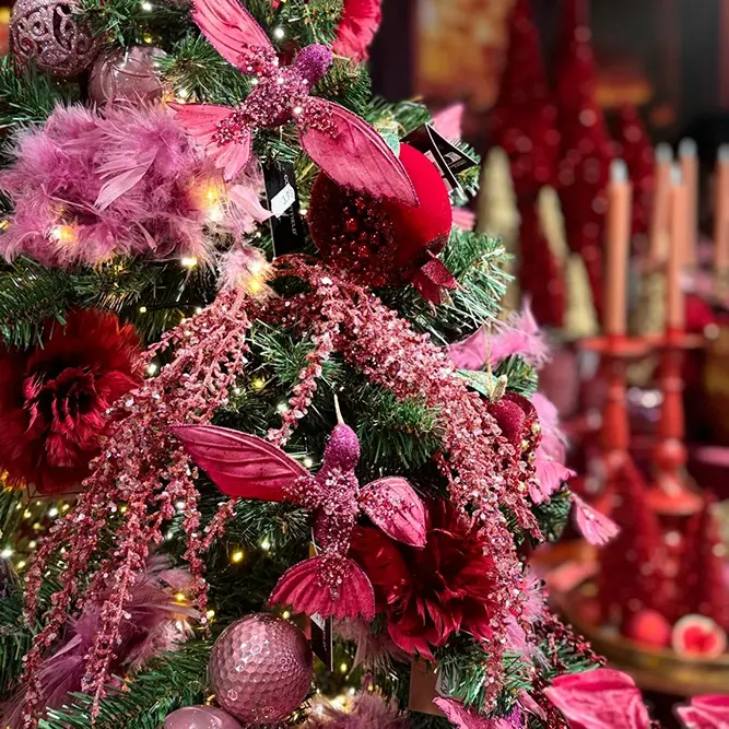 Burgundy Bloom incarne le luxe, le glamour et la chaleur. Des sapins rouges et roses, des détails dorés et du velours créent une ambiance élégante et remarquablement festive. Ce thème montre qu’un sapin de Noël n’a pas toujours besoin d’être vert et que audace, élégance et richesse peuvent parfaitement s’associer.