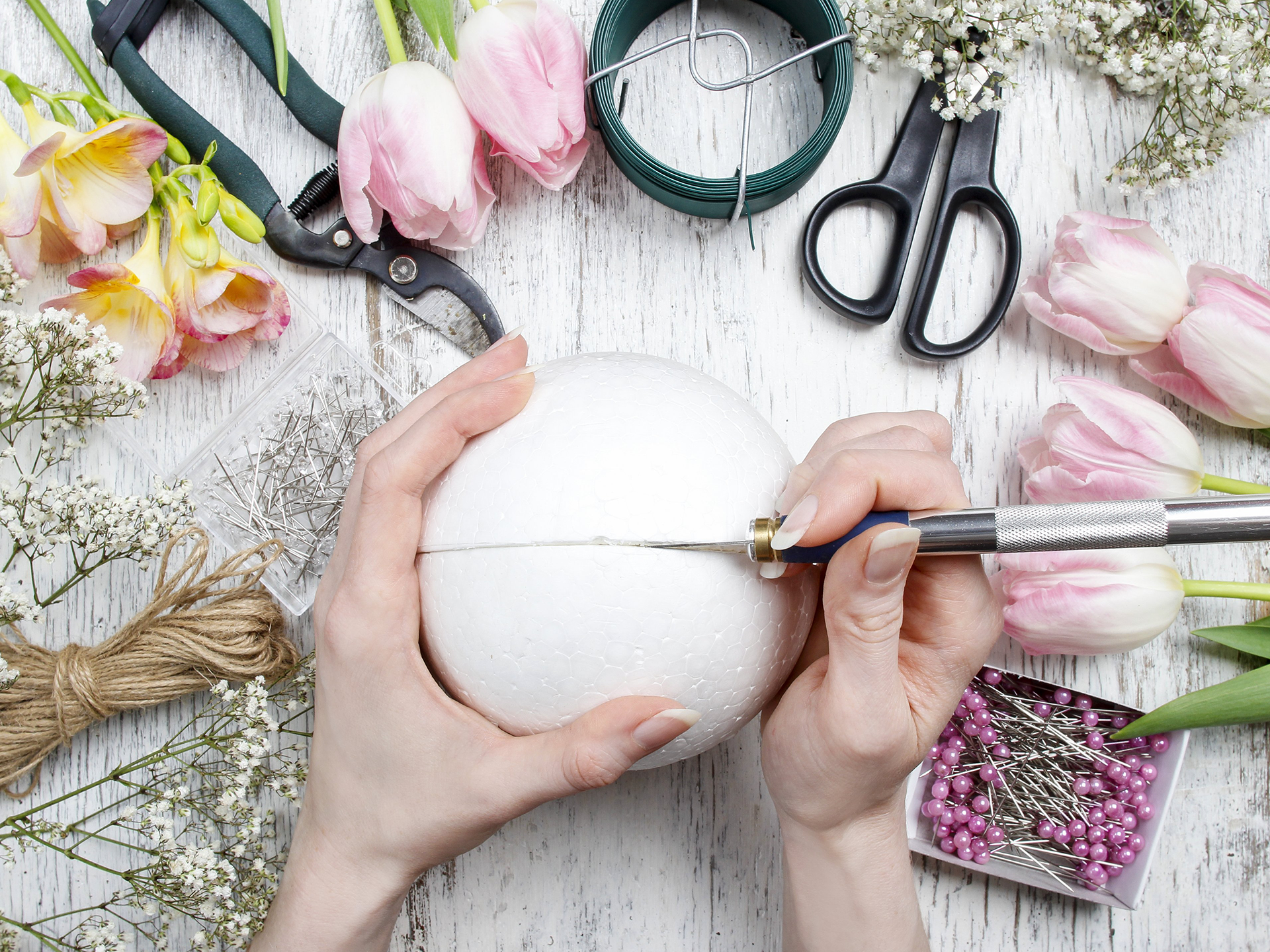 Piepschuim wordt ook vaak gebruikt bij het bloemschikken. We hebben dit materiaal ook in allerlei vormen en afmetingen : bol, vierkant, kubus, ronde, … Je kunt het piepschuim bekleden en versieren met allerlei creatieve en natuurlijke materialen.