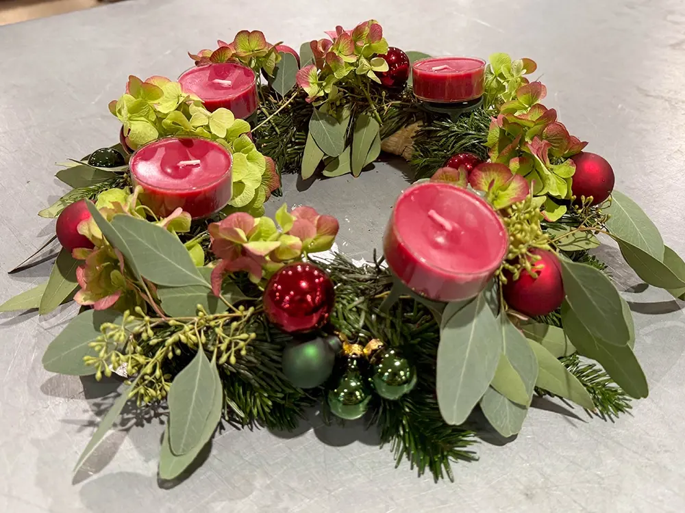 Tijd voor wat extra kerstgroen! Schik de Eucalyptus met bes rond de krans. De bloemendraad die je eerder rond de krans wikkelde, komt hierbij goed van pas. Maak ze extra vast te maken met een klein krammetje. Zo vermijd je dat de eucalyptus in contact komt met het theelichtje. De Hortensia knip je in afzonderlijke deeltjes en bevestig je met de krammetjes op de krans.
