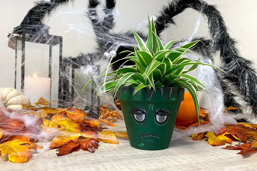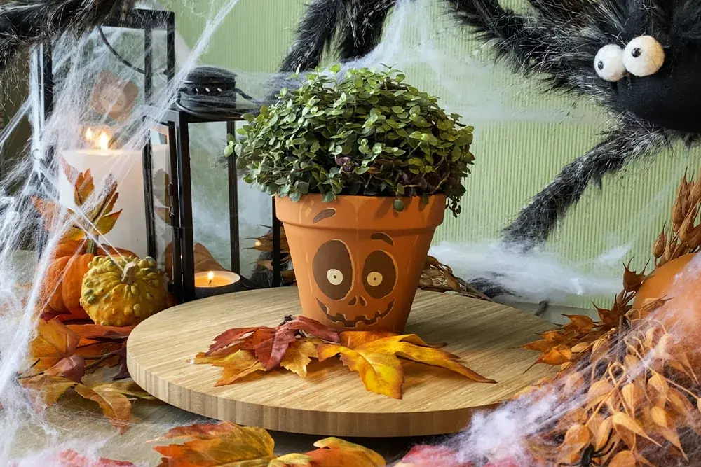 De getekende vlakken kan je nu ook beschilderen. Voeg hier en daar wat extra finishing touches toe en je Halloween DIY-potje is klaar. Nu moet je enkel nog zijn weelderige haardos, oftewel het plantje erin plaatsen.