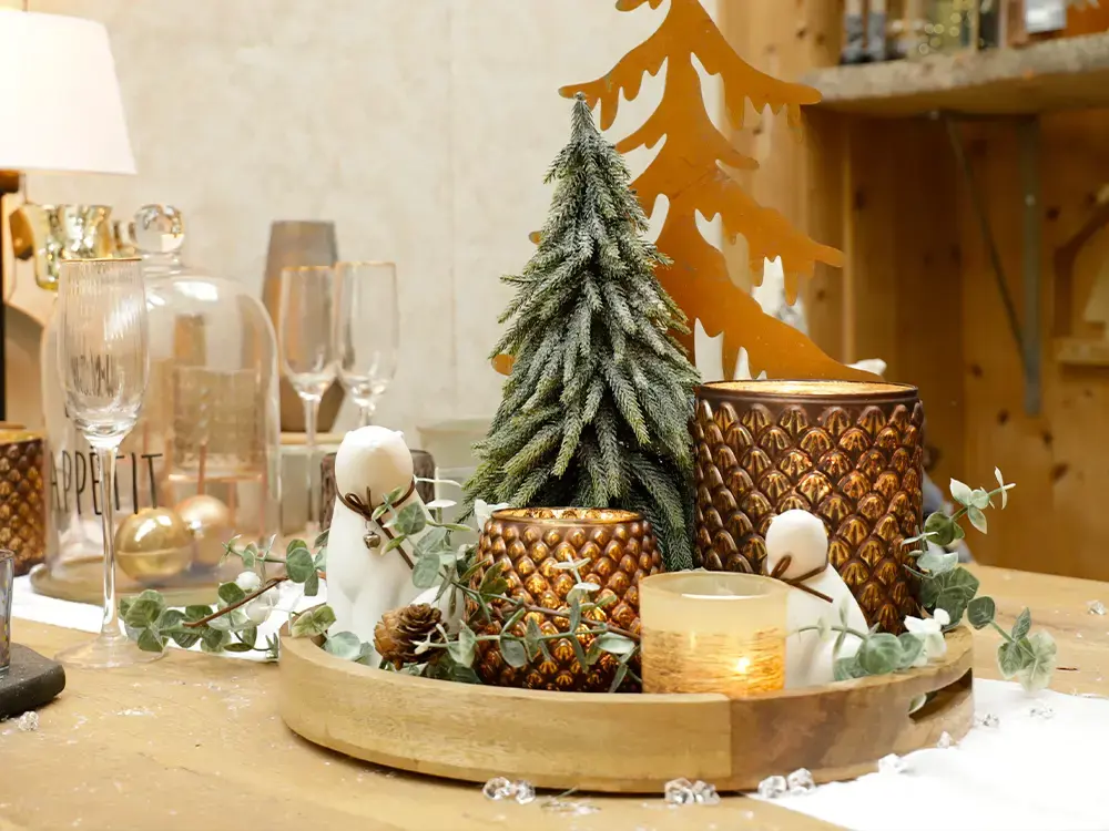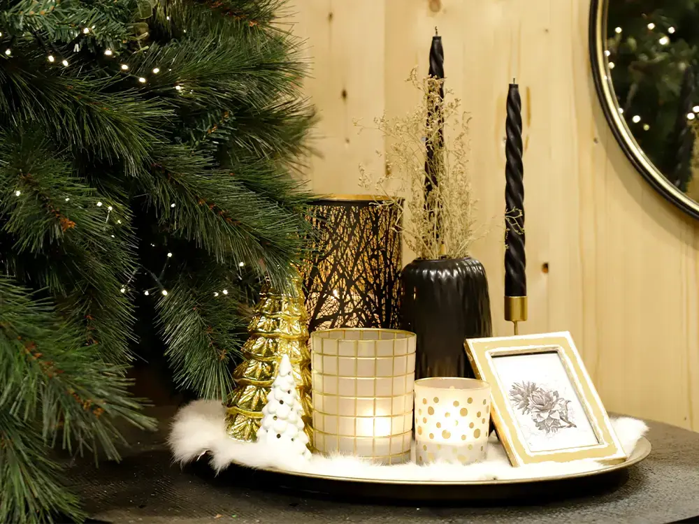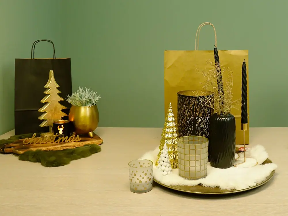 Die gezelligheid laten we natuurlijk terugkomen in de decoratie die we op de schaal plaatsen en dan kunnen kaarsen niet ontbreken. Grote, kleine, los of in een t-lichtpotje? De keuze is aan jou! (Kleine tip: een combinatie geeft altijd een mooi resultaat.) De schaal vul je verder aan met een plant, kerstboom of kandelaar én een leuk figuurtje. Zo springt je kerstgeschenk er zeker tussenuit.