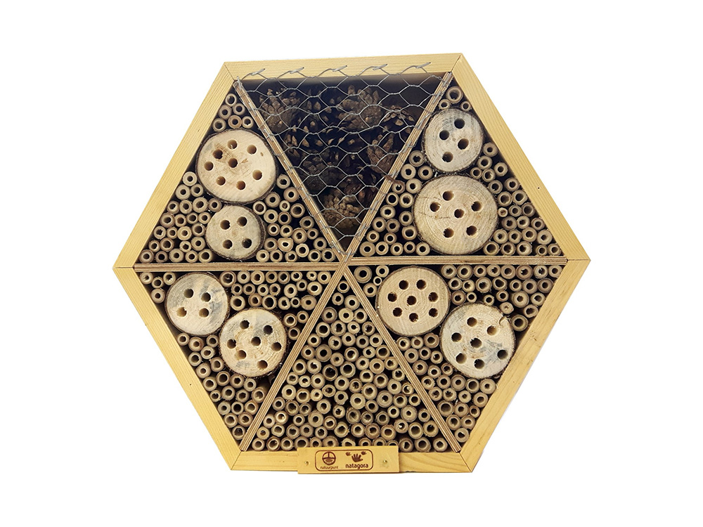 Een mooi en zeer degelijk insectenhotel in de vorm van een honingraat dat een grote aantrekkingskracht zal hebben op bijen en andere insecten. De binnenkant van het stevig frame is onderverdeeld in zes delen die elk opgevuld zijn met bamboestokjes, rondhout en dennenappels. Ideaal voor solitaire bijen, spinnen, oorwormen, zweefvliegen en lieveheersbeestjes.