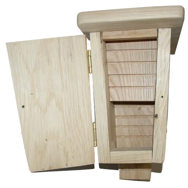 - Onderhoud: Er is geen speciaal onderhoud nodig voor deze vleermuizenkast, aangezien het gemaakt is van erg kwalitatief eikenhout. Het hout zal natuurlijk grijzer kleuren, maar mocht je dan toch iets willen doen, zorg er dan voor dat je dit doet met producten op waterbasis die niet giftig zijn.