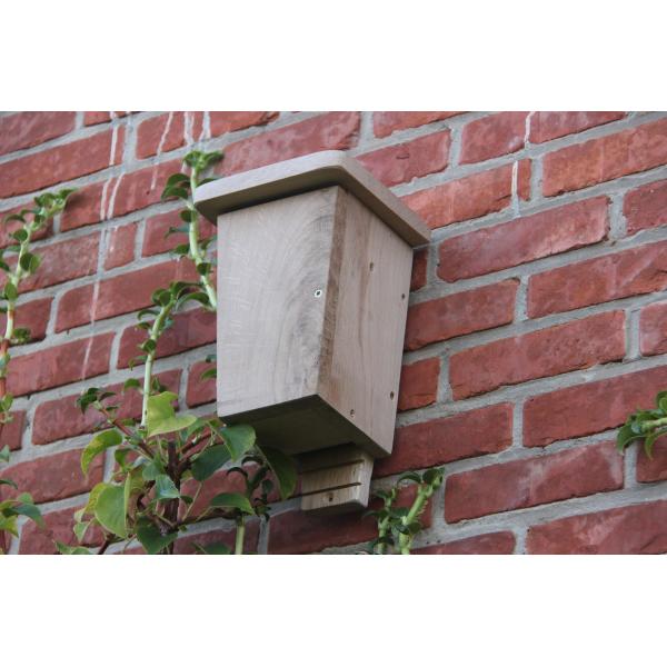 De smalle ingang van deze vleermuizenkast zorgt ervoor dat de vleermuizen rustig slapen, zonder bedreiging van roofvogels. Het luik aan de voorkant kan geopend worden ter observatie, of om de vleermuizenkast te reinigen. Doe dit niet in de periode van maart tot oktober, aangezien je daarmee de vleermuizen kunt afschrikken. Deze vleermuizenkast met twee kamers is binnenin uitgerust met een 'laddertje' waaraan de vleermuizen ondersteboven hangen te slapen. De vleermuiskast moet hoog, tussen 2,5 en 5 m, aan een gebouw of volwassen boom worden gehangen met behulp van de voorgeboorde achterplaat.