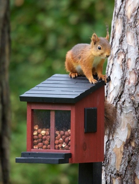 Eekhoorns zijn intelligente dieren en leren snel hoe zij bij allerhande lekkernijen kunnen komen, hoe moeilijk dat soms ook lijkt te zijn. Het dak sluit weer op het moment dat de eekhoorn klaar is met eten zodat andere dieren en vogels niet bij het voer kunnen.