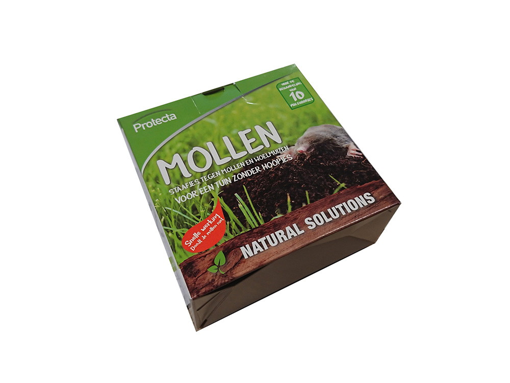 Een set van tien staafjes die zijn samengesteld uit een natuurlijk plantenextract. Deze anti-mollenstokjes zijn een natuurlijke oplossing tegen de activiteit van mollen, woelratten en woelmuizen.