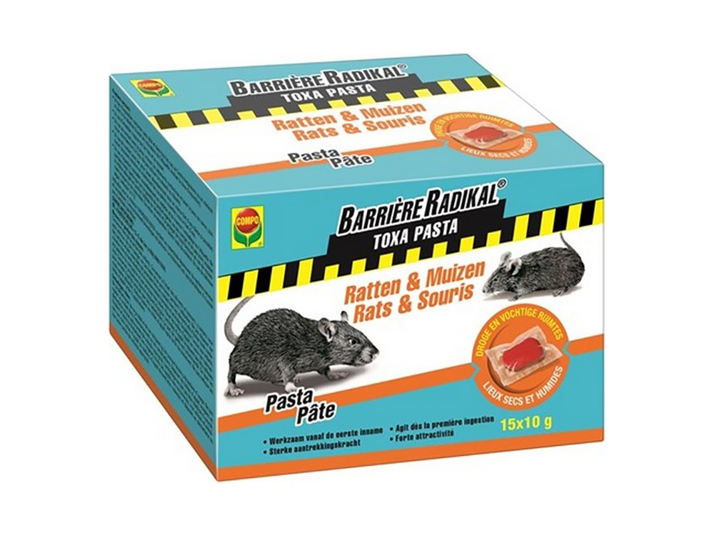 Toxa pasta van Compo is een klaar-voor gebruik lokaas voor de bestrijding van knaagdieren en om de schade die ze veroorzaken te voorkomen. De ingrediënten zijn speciaal geselecteerd vanwege hun aantrekking op knaagdieren, wat een effectief resultaat oplevert. Op die manier kan een ratten- of muizenplaag snel onder controle worden gehouden.