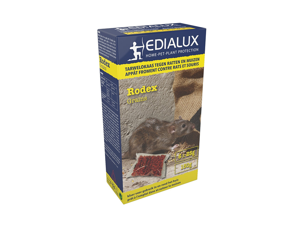 Rodex Grains van Edialux is een aantrekkelijk kant- en klaar lokaas op basis van tarwe. Het is een effectief middel voor de bestrijding van muizen en ratten binnenshuis en tegen ratten buitenshuis, rond gebouwen. Het lokaas wordt geleverd inclusief lokaasdoos om het gif veilig te kunnen toedienen.