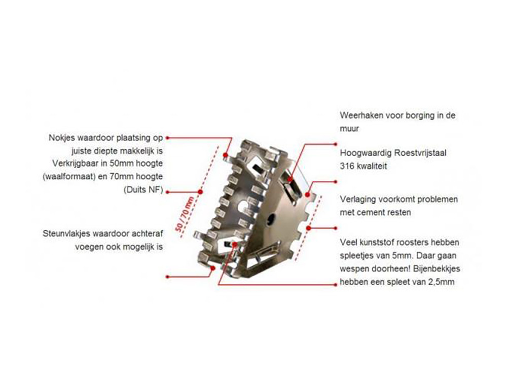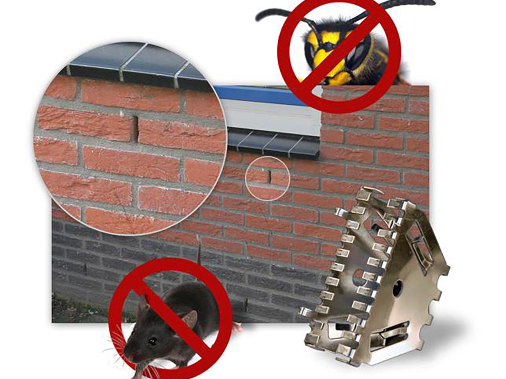 Doordat deze stootvoegroosters achteraan smaller zijn dan vooraan passen ze vlot in elke stootvoeg ondanks de betonrestanten. Na het plaatsen hebben de roosters kieren van ca. 2,5 mm waardoor er voldoende ventilatie is, maar het ongedierte niet meer naar binnen kan.