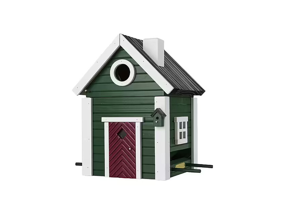 Het huisje bevat een 2- liter reservoir voor vogelzaad. De ronde invliegopening kan afgesloten worden op het moment dat het als voederhuisje dienst doet. Het is geschikt voor kleine vogels omdat de afmetingen dusdanig zijn dat grotere vogels er niet op kunnen landen. Het voeder ligt bovendien goed beschermd tegen wind, regen en de uitwerpselen van vogels. Het bevestigingssysteem maakt het schoonmaken en bijvullen van de huisjes nu nog gemakkelijker.
