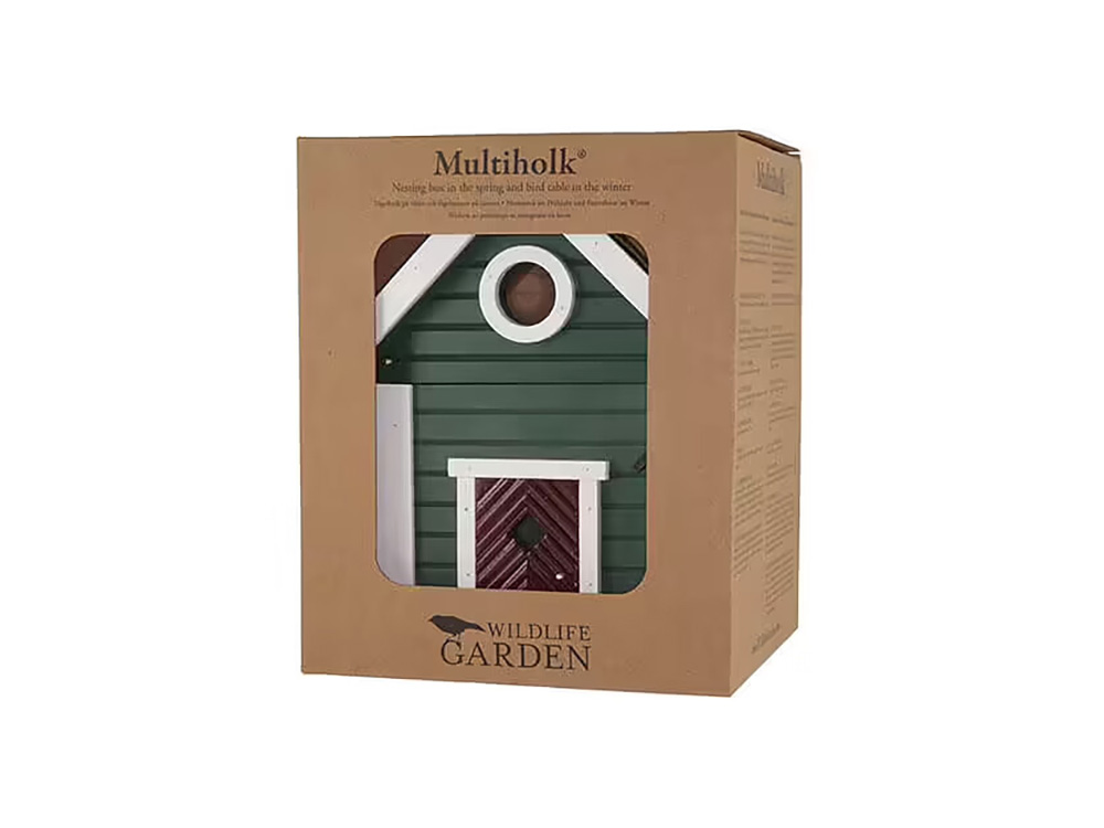 Vogelhuis en voederhuis onder 1 dak ontworpen naar het voorbeeld van de traditionele woningen in Scandinavië of de Amerikaanse huizen van New England. Dit unieke vogelhuisje kan zowel op een paal als tegen een schutting/muur bevestigd worden met het bijgeleverde bevestigingsmateriaal. Het vogelhuisje is te gebruiken als voederhuis in de winter en als nestkastje voor mezen in de lente.