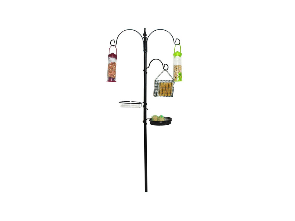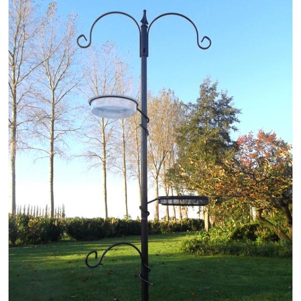 Dit voederstation bestaat bovenaan uit een vaste dubbele voederhaak. Daarbij komen nog eens drie losse verstelbare voederhaken waarvan één met voeder- en één met drinkschaal. Zowel de meegeleverde voeder- als de drinkschaal zijn uitneembaar. Het station bestaat uit drie in elkaar schuifbare antraciet gecoate buizen waarvan één met grondpin.