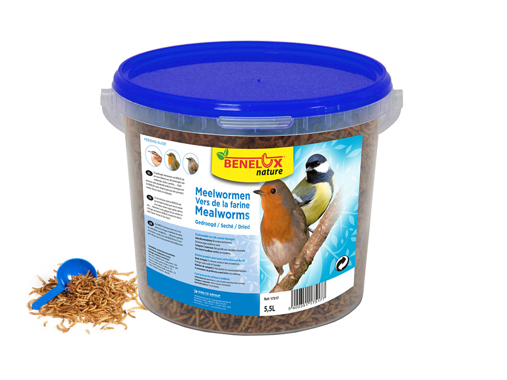 Gedroogde meelwormen zijn een uitstekende bron van energie die je het hele jaar door als voer mag aanbieden aan de vogels in de tuin. Roodborstjes, kwikstaartjes, lijsters en merels zijn verzot op deze gedroogde meelwormen. De voordelen zijn dat de smaak behouden blijft, het volume en gewicht afnemen en ze zeer lang houdbaar zijn.