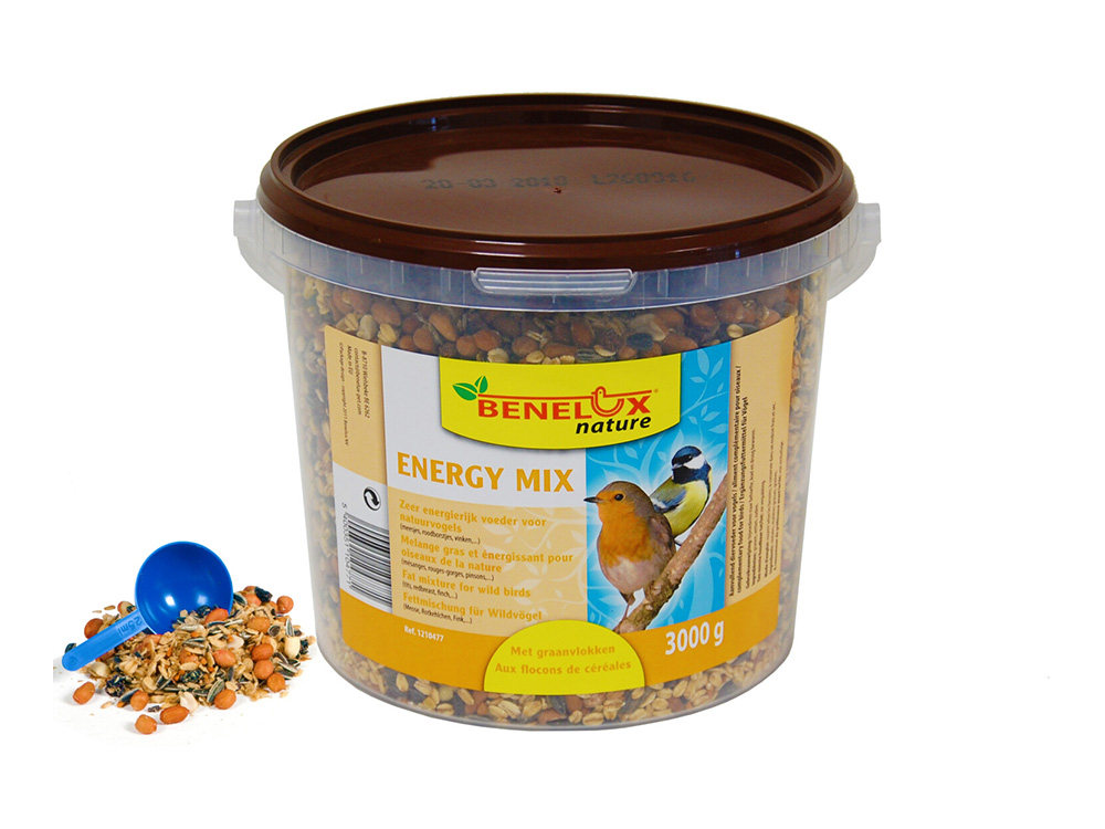 Zeer energierijk voeder met graanvlokken, zaden, gedroogde besjes, zwarte zonnebloempitten, gepelde pindanoten,... voor vogels in de tuin.