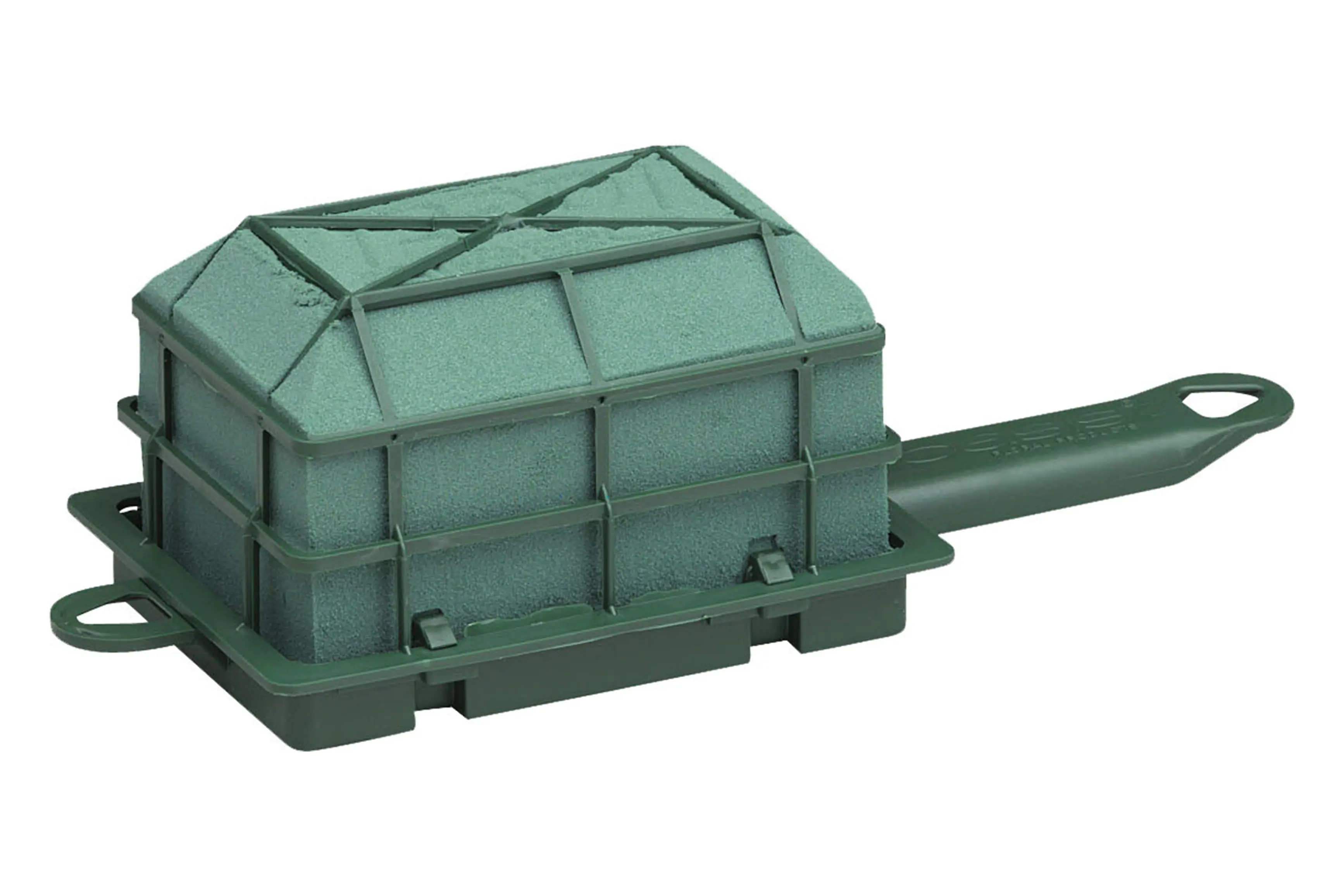 Oasis steekschuim 'Florette' voor het maken van bloemstukken. Deze houder is de meest gebruikte vorm voor rouwdecoraties. De blok wordt geleverd in een stevige houder met handvat zodat je het rouwstuk makkelijk kan meenemen.