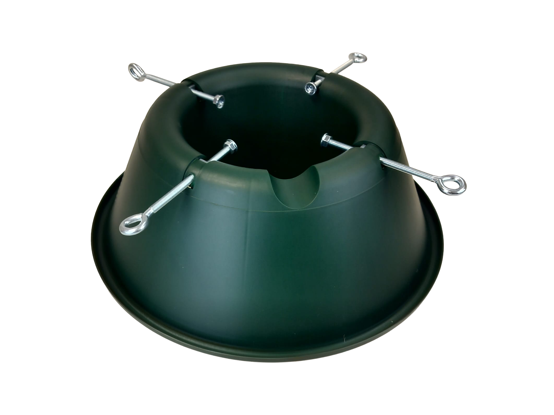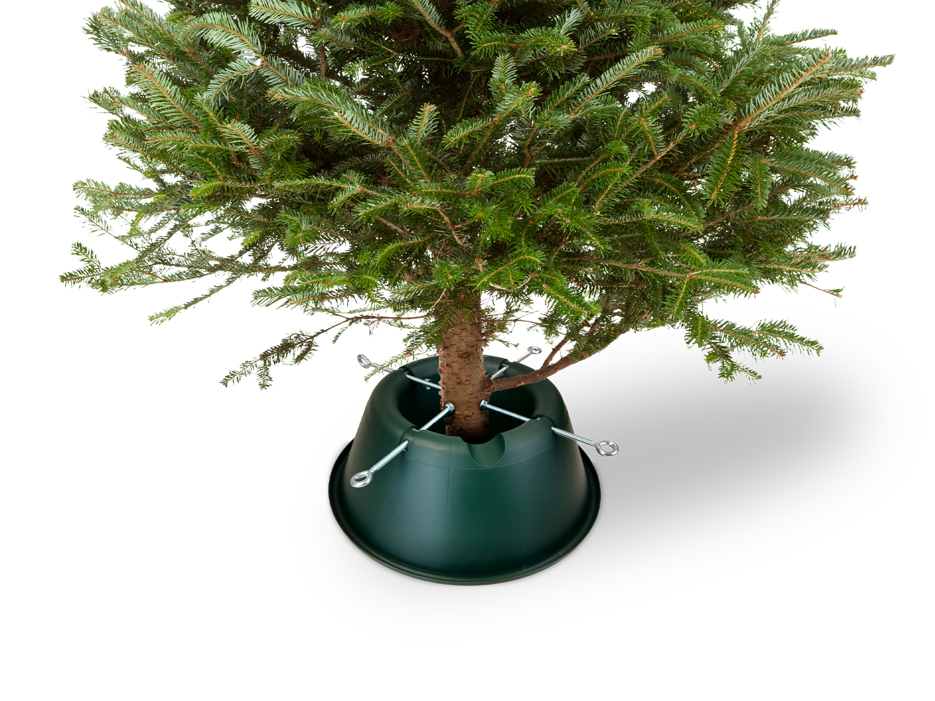 Plastic kerstboomvoet met wateropvang, duurzaam en herbruikbaar – verkrijgbaar in maat M en L.