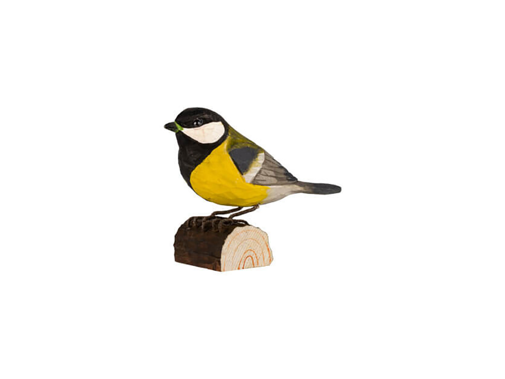 Ambachtelijk vormgegeven houten koolmees. De koolmees wordt op ware grootte weergegeven en is beschilderd met milieuvriendelijke verf. Het beeldje wordt geleverd met een stokje waarmee de vogel ter decoratie in een bloempot gestoken kan worden.