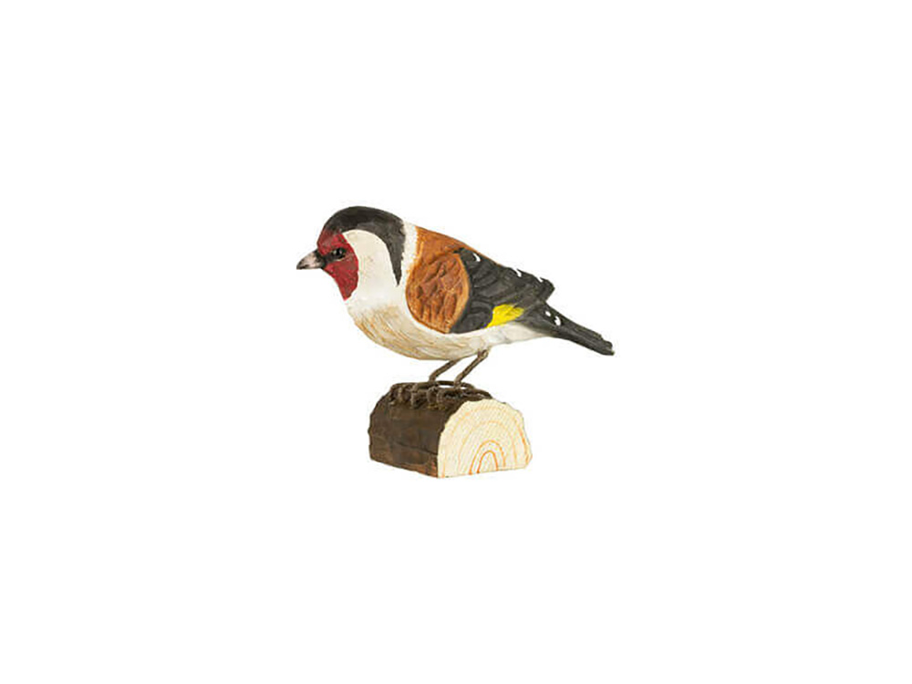 Ambachtelijk vormgegeven houten distelvink of putter. De distelvink wordt op ware grootte weergegeven en is beschilderd met milieuvriendelijke verf. Het beeldje wordt geleverd met een stokje waarmee de vogel ter decoratie in een bloempot gestoken kan worden.