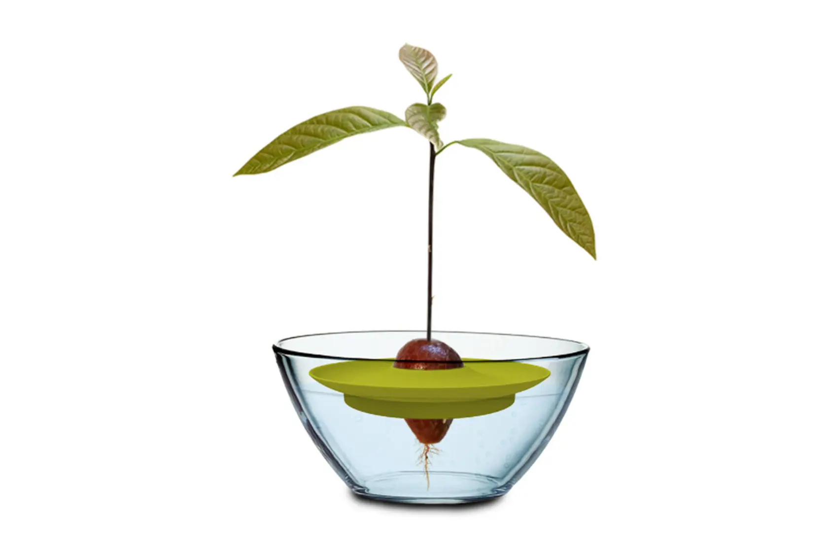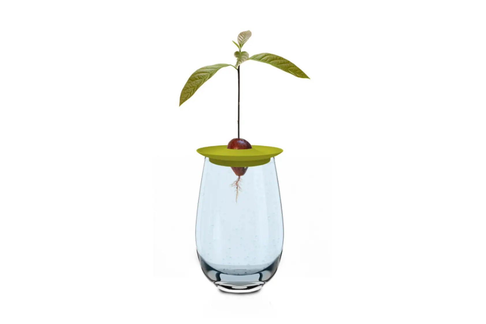 Met de Avocado Growing Kit kan je een avocado pit laten ontkiemen en zo je eigen avocadoplant kweken. Verwijder eenvoudig de pit van een rijpe avocado, spoel hem grondig en plaats de pit met de platte kant naar beneden in de opening van de Growing Kit. Leg de vlotter in een schaal met water, over de rand of al drijvend in het water.