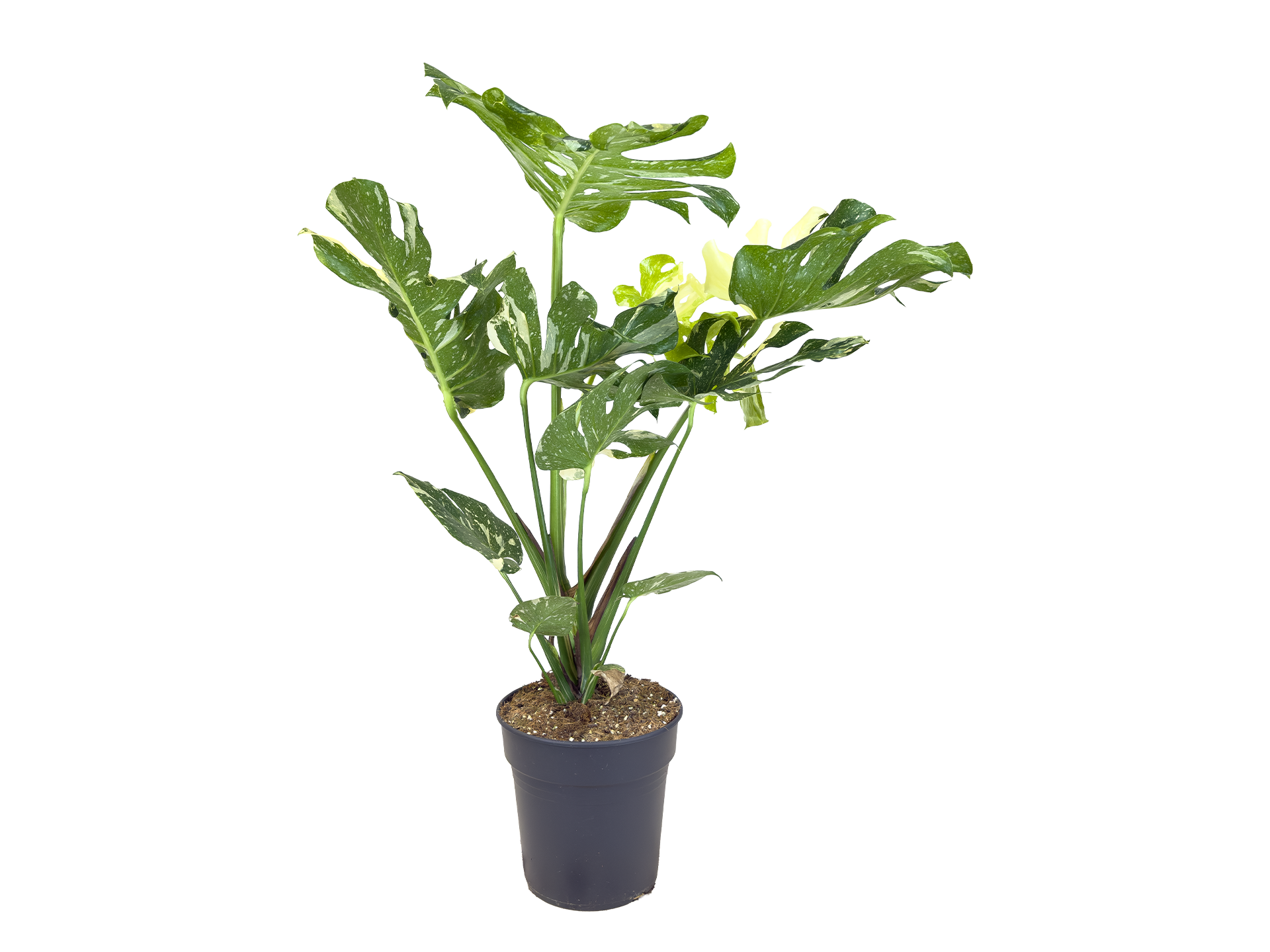De Monstera Thai Constellation is een bijzondere en decoratieve kamerplant met grote, glanzende bladeren die uniek gevlekt zijn in crème-witte patronen. Deze opvallende bladtekening maakt van elke plant een blikvanger en geeft direct een luxueuze, tropische uitstraling aan je interieur.