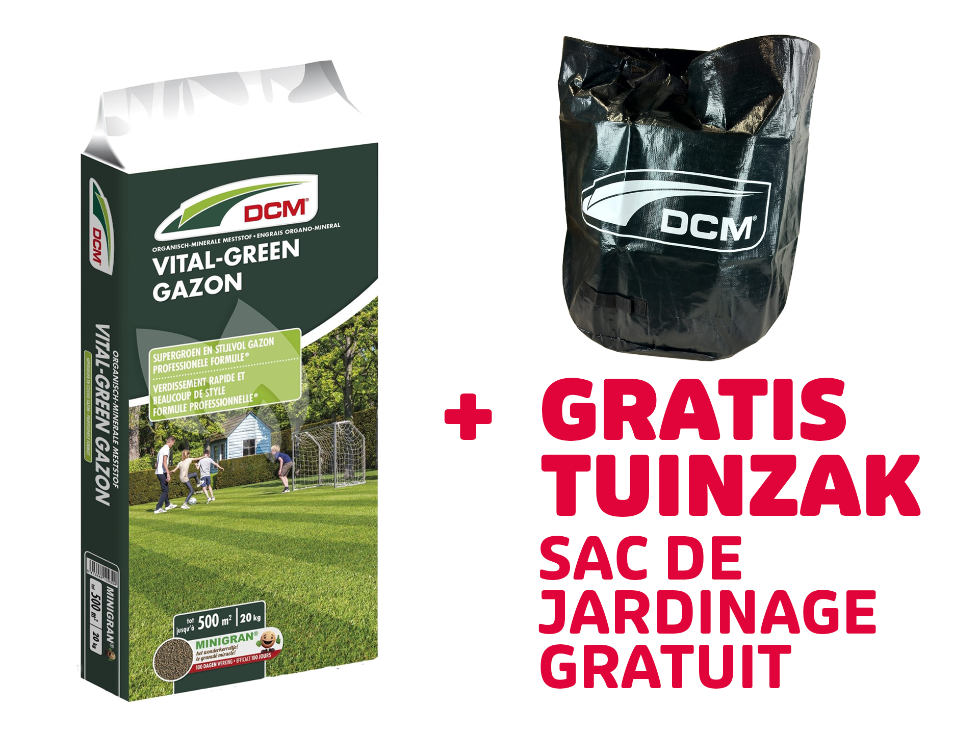 DCM gazonmeststoffen – Vital Green 20 kg met gratis DCM emmer of Aqua Balance 18 kg met gratis DCM tuinzak.