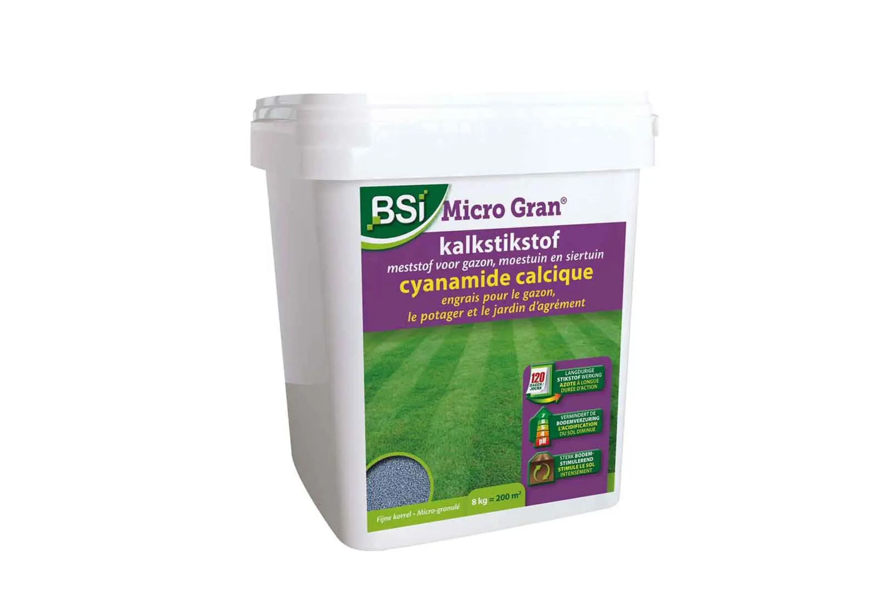 BSI Micro Gran meststof voor gazon, moestuin en siertuin. Deze kalkstikstof of cyanamide werkt sterk bodemstimulerend en vermindert de bodemverzuring. Dankzij de microkorrels is de meststof perfect strooibaar.