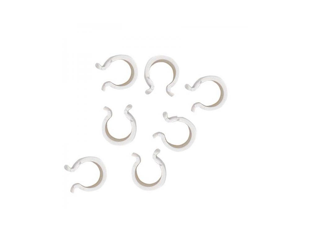 Stevige kunststof klemmen voor het vastzetten van folie, insectengaas, weringsnet of zeil aan buisvormige structuren.