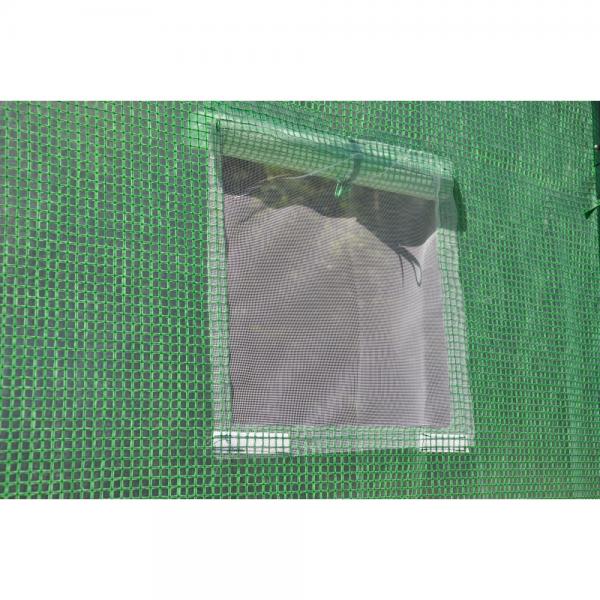 Het geheel is overspannen met groen UV-bestendige, gewapende folie en laat een diffuus groeilicht door. De kas is voorzien van 4 afsluitbare horrengaasramen voor optimale beluchting, Eén aan beide korte zijden en 2 stuks aan de achterzijde van de kas. Verankering van de kas aan de ondergrond met nylon schoorlijnen, 5 stalen en 6 kunststof grondpennen van 25 cm.