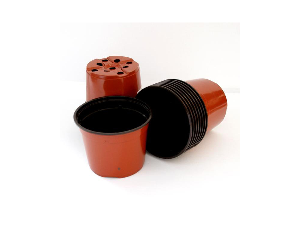 Bruine ronde potten met een eersteklas bodem voor optimale afwatering en ventilatie, ook voor irrigatie met irrigatiematten. Deze kwalitatieve kunststof kweekpotten kunnen meerdere keren hergebruikt worden.