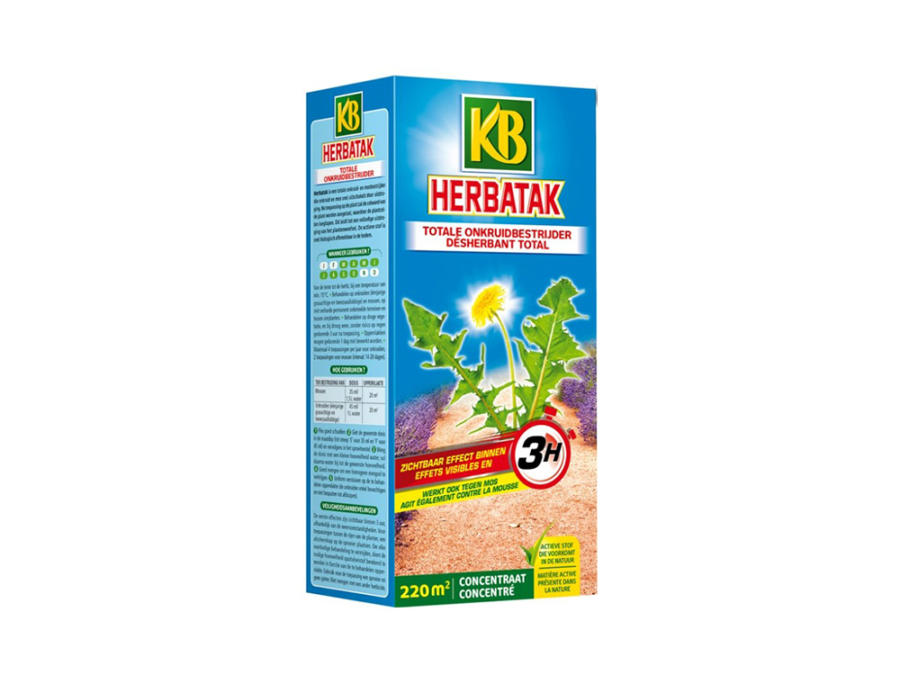 Herbatak is een totale onkruid - en mosbestrijder op basis van pelargonzuur, een actieve stof die voorkomt in de natuur en biologisch afbreekbaar is in minder dan 2 dagen. Herbatak schakelt snel onkruid en mos uit door uitdroging.