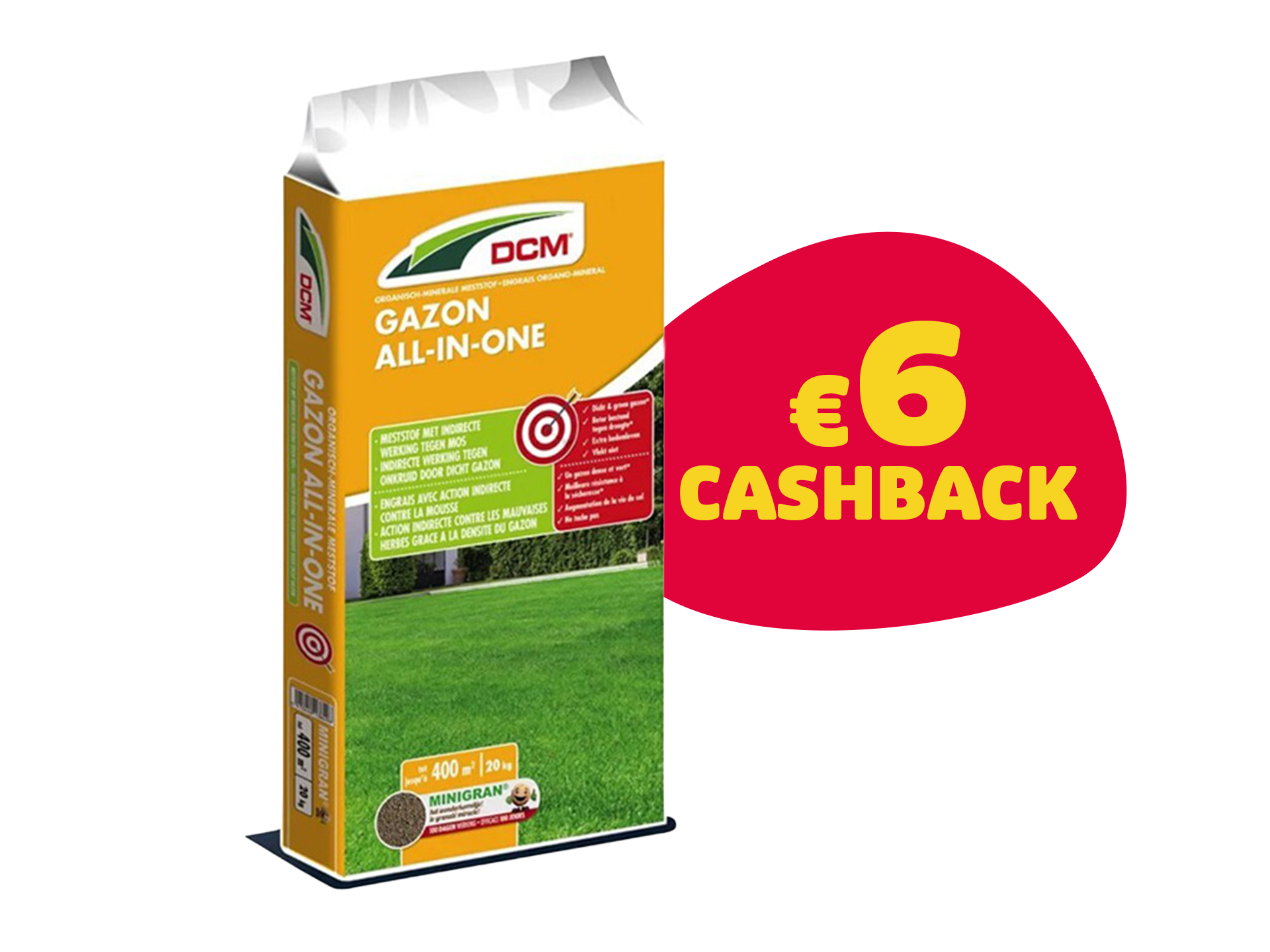 DCM Gazon All-In-One 20 kg – combineert voeding en bescherming tegen mos en vilt. Actie: bij aankoop ontvang je €6 cashback, zodat je gazonextra voordelig wordt verzorgd.