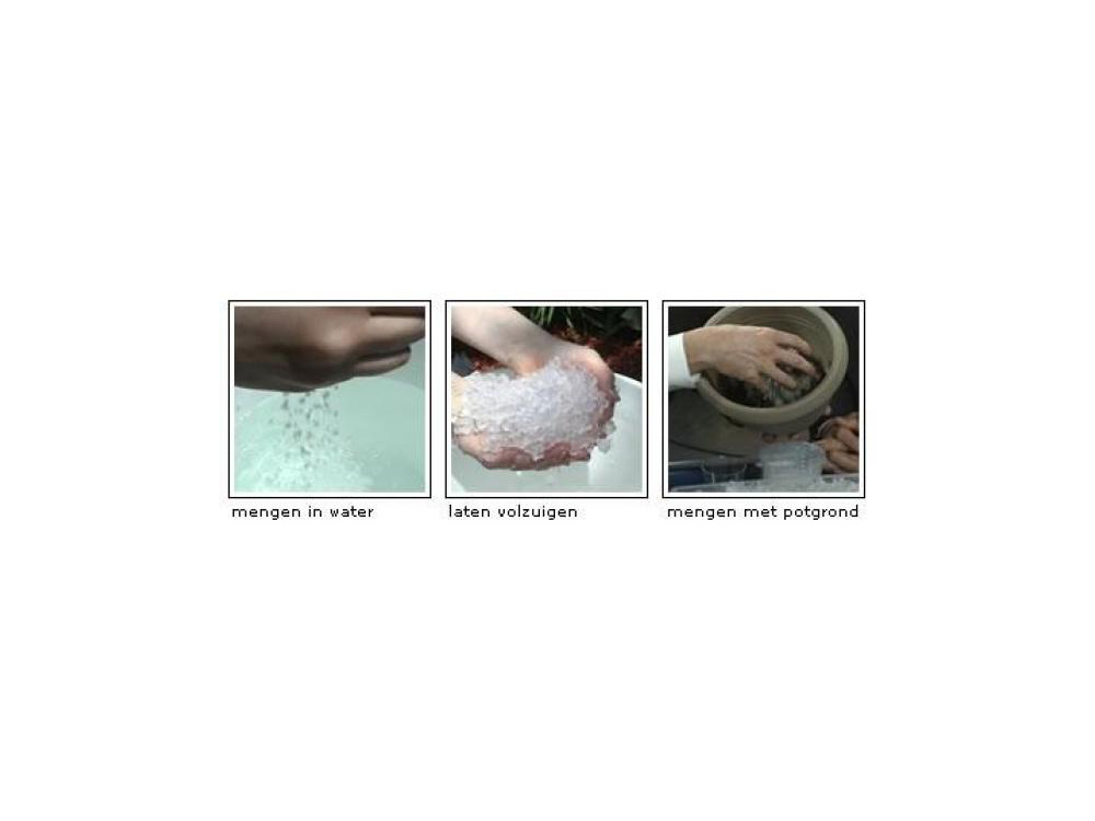 Het gietwater wordt geabsorbeerd en komt pas terug langzaam vrij als de planten er behoefte aan hebben. De kristallen voorkomen uitdroging van de (pot)grond en zorgen voor een regelmatige plantengroei en mooiere planten.
