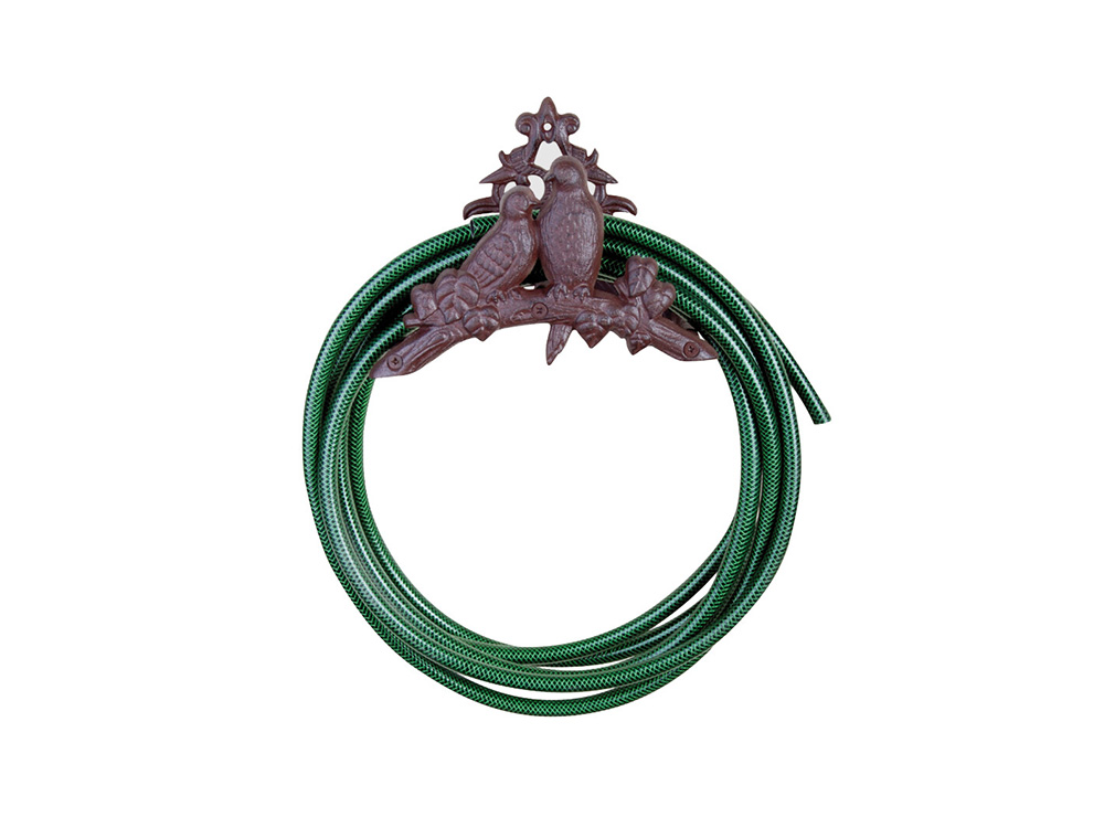 Decoratieve, rustieke tuinslanghouder met vogels en sierlijke krullen. Monteer de houder op de gewenste hoogte aan de muur of het tuinhuis en wikkel de tuinslang in lussen om de houder. Zo heb je nooit geen last meer van een rondslingerende tuinslang.