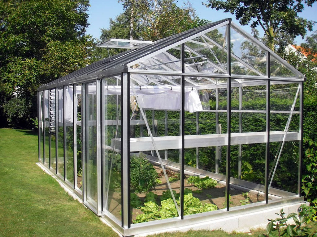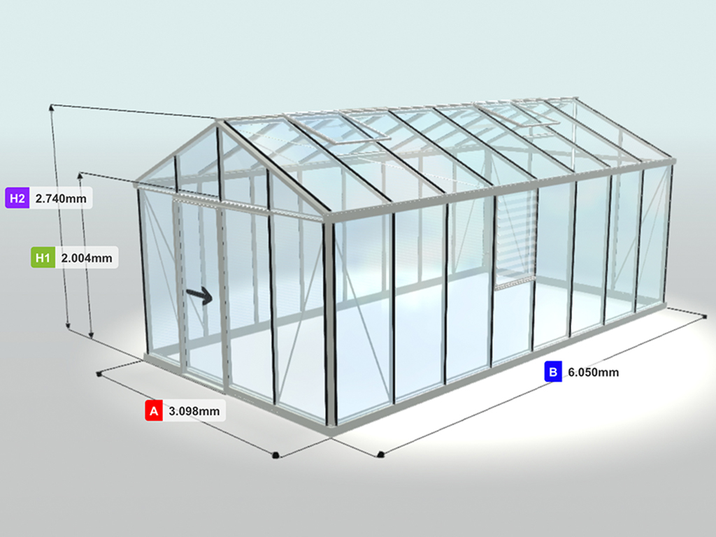 Deze premium serre (nokhoogte 274 cm) is standaard uitgerust met 1 schuifdeur, 4 dakramen en 1 louvreraam. De breedte-diepte verhouding van deze serre is 4 x 8 ruiten. Dit model Helios Master heeft een werkoppervlakte van bijna 19 m² en en wordt standaard geleverd in een blank aluminium frame.