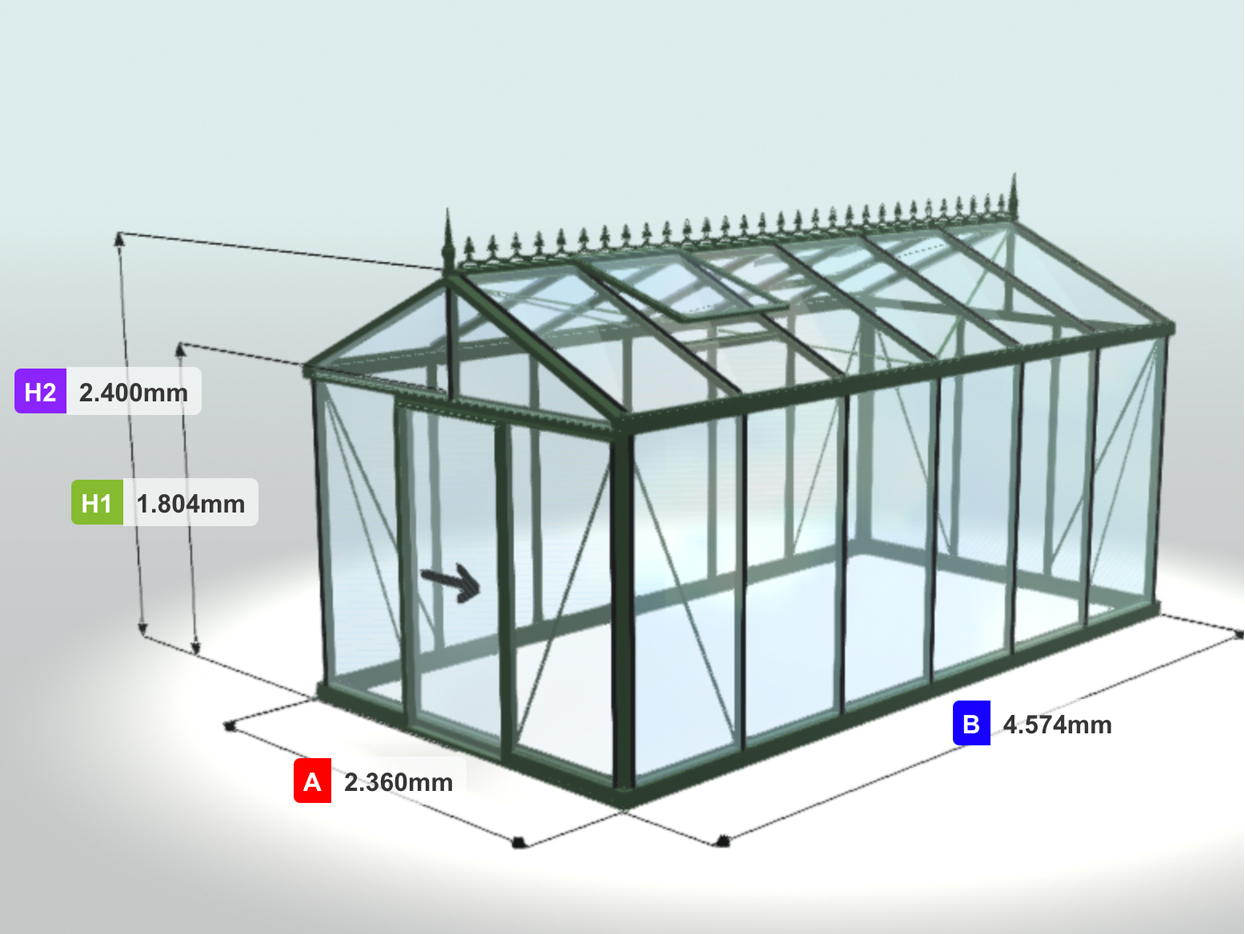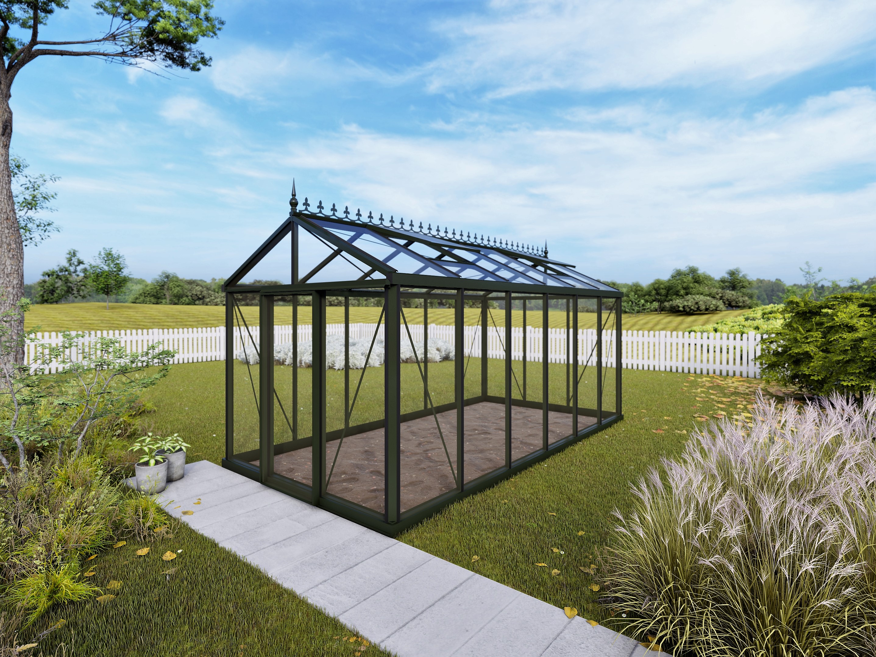 Deze klassieke Helios Senior (nokhoogte 240 cm) is standaard uitgerust met 1 schuifdeur en 2 dakramen. De breedte-diepte verhouding van deze serre is 3 x 6 ruiten. Dit model Helios Senior heeft een werkoppervlakte bijna 11 m² en is vakkundig afgewerkt met een kwalitatieve donkergroene poedercoating (ralkleur: 6009m, Qualicoat-norm).
