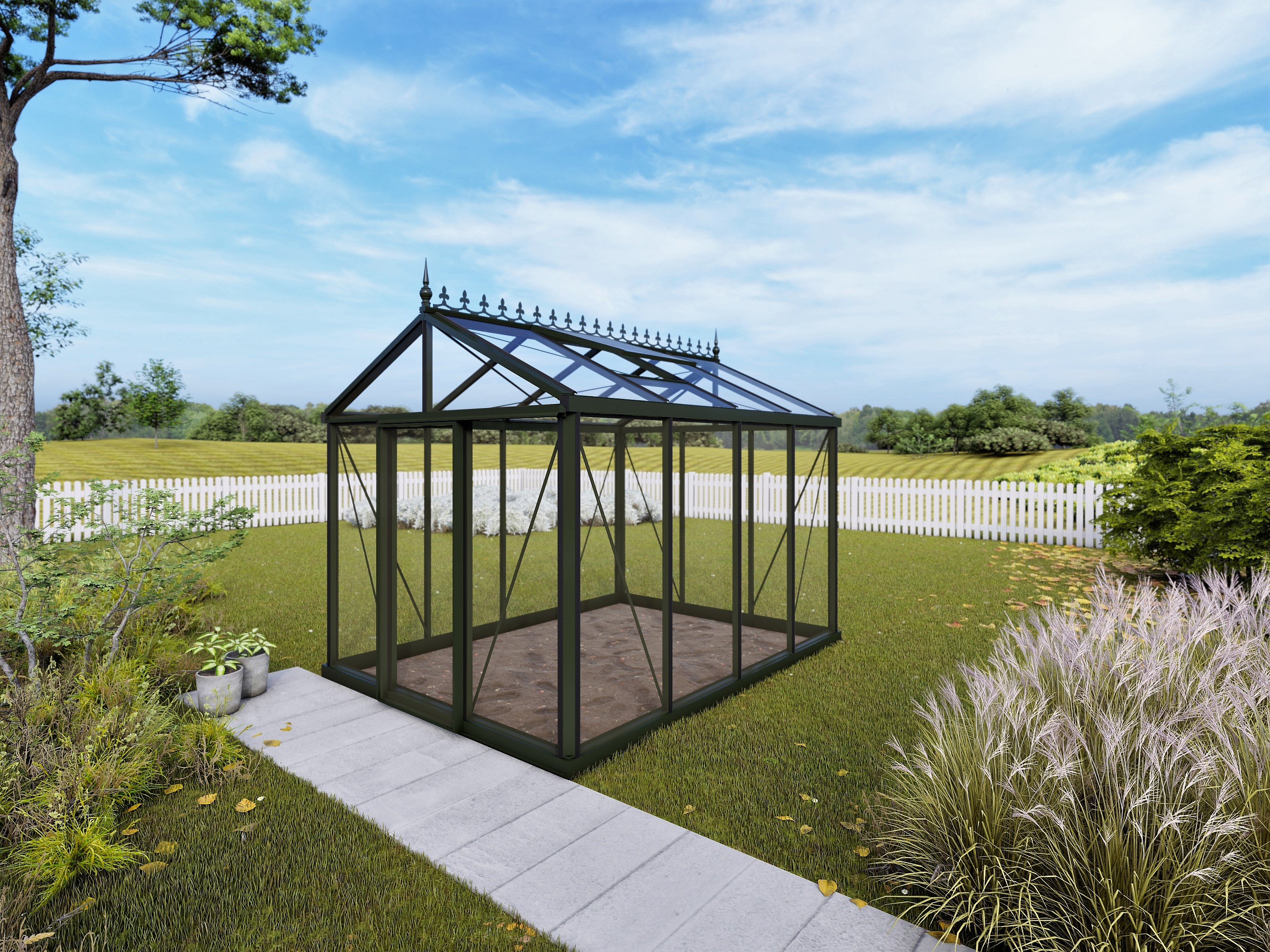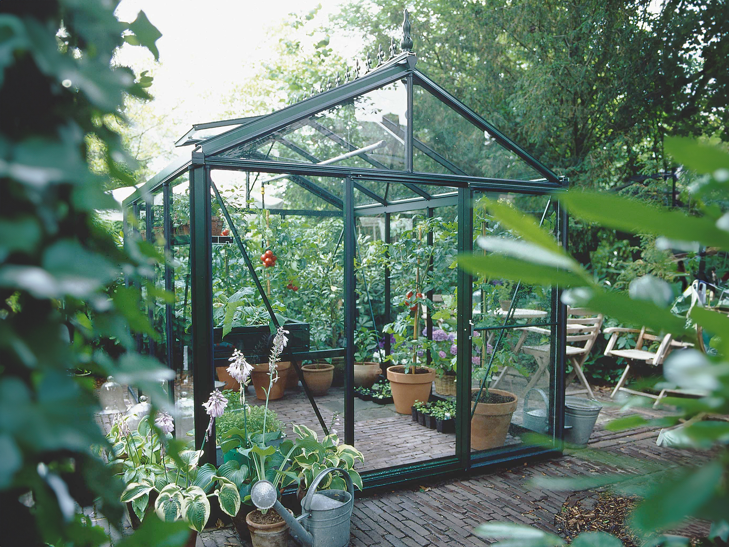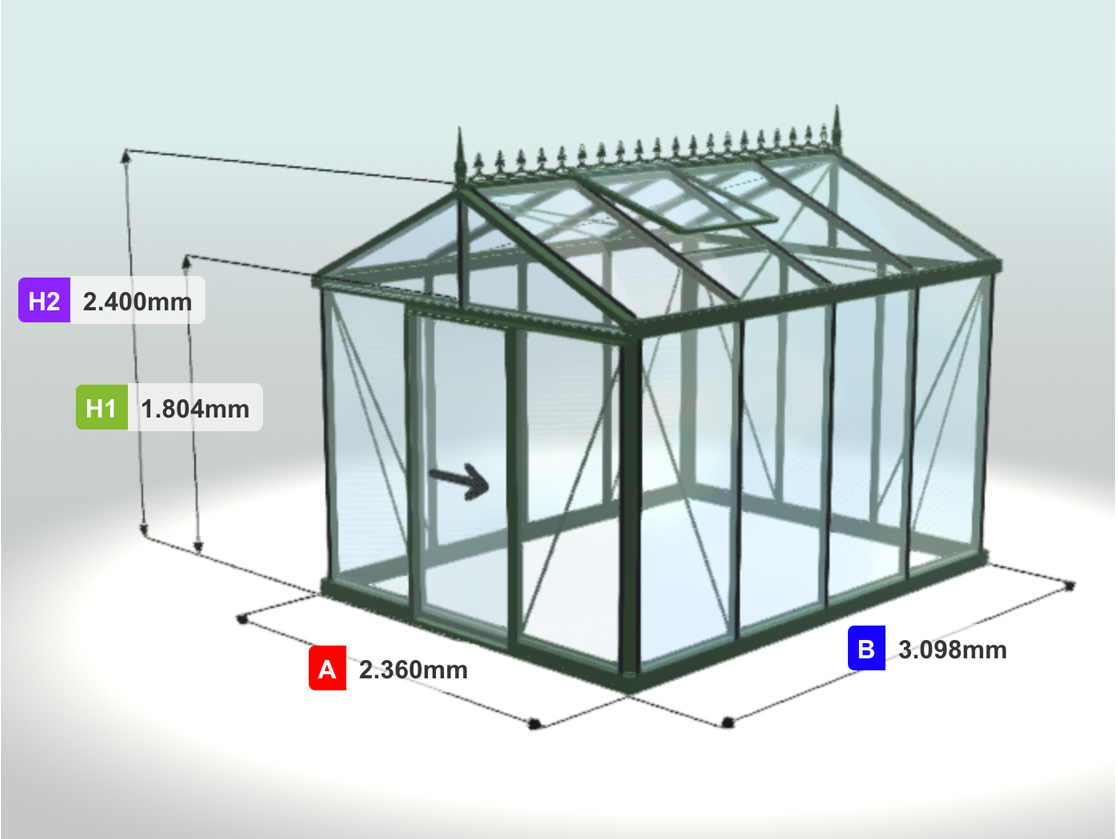 Deze klassieke Helios Senior (nokhoogte 240 cm) is standaard uitgerust met 1 schuifdeur en 1 dakraam. De breedte-diepte verhouding van deze serre is 3 x 4 ruiten. Dit model Helios Senior heeft een werkoppervlakte van ca. 7 m² en is vakkundig afgewerkt met een kwalitatieve donkergroene poedercoating (ralkleur: 6009m, Qualicoat-norm). Het meegeleverde louvreraam heeft een zwarte kleur.