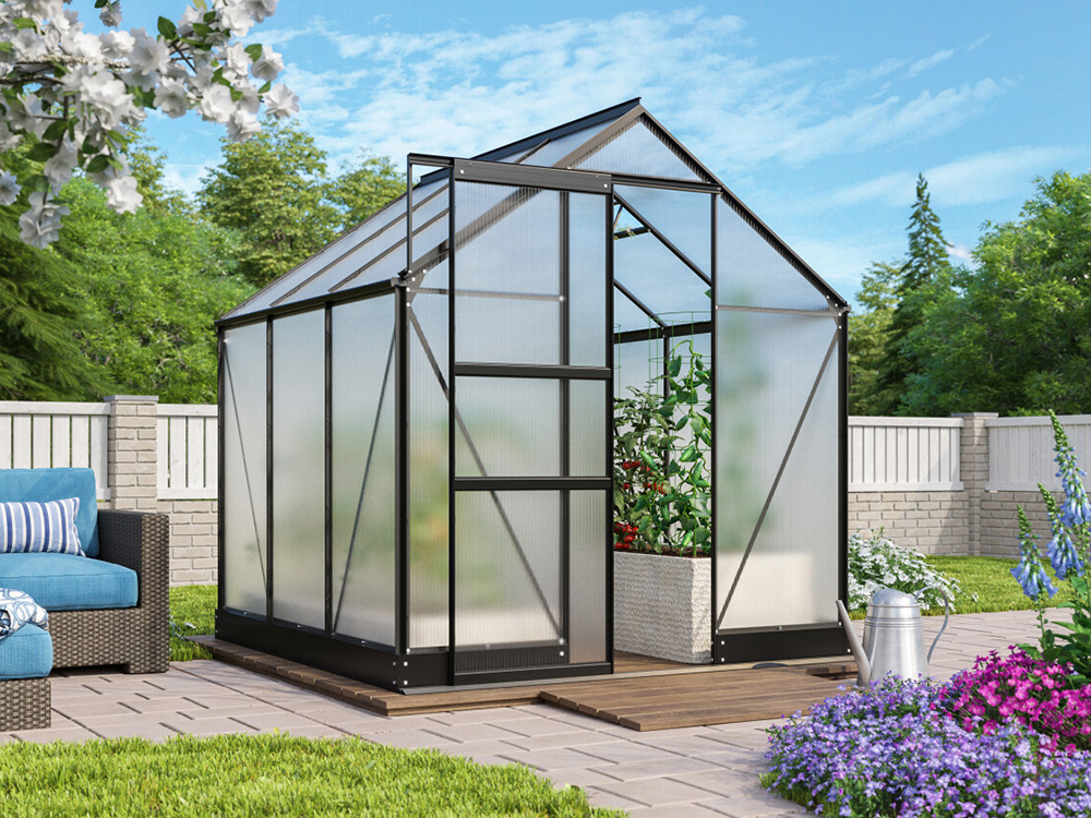 Het stevige frame is vervaardigd uit zwart poedergecoat aluminium, wat zorgt voor een luxueuze uitstraling. De schuifdeur, met een breedte van 61 cm, kan zo worden gemonteerd dat ze zowel naar links als naar rechts kan openen. Daarnaast is de kas uitgerust met geïntegreerde dakgoten en een fundering die zorgt voor een solide en stabiele verbinding met het frame.