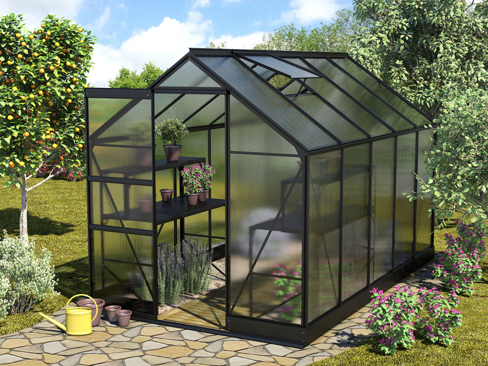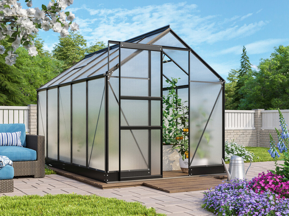 Het stevige frame is vervaardigd uit zwart poedergecoat aluminium, wat zorgt voor een luxueuze uitstraling. De schuifdeur, met een breedte van 61 cm, kan zo worden gemonteerd dat ze zowel naar links als naar rechts kan openen. Daarnaast is de kas uitgerust met geïntegreerde dakgoten en een fundering die zorgt voor een solide en stabiele verbinding met het frame.