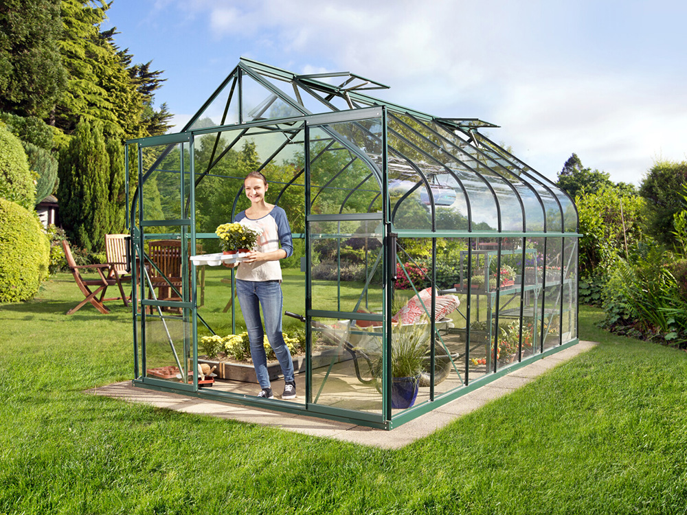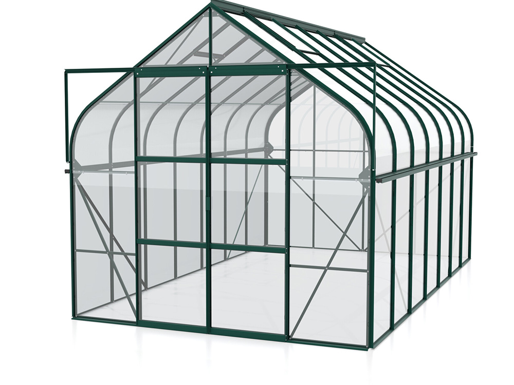 De kas is gemaakt van sterk, groen gepoedercoat aluminium en standaard uitgerust met 3 mm veiligheidsglas voor een stevige constructie en maximale lichtinval. De gebogen randen zijn afgewerkt met UV-bestendige, heldere polycarbonaatplaten. Extra praktische details zijn de geïntegreerde goten en 1 tot 4 dakramen (afhankelijk van de grootte) voor optimale ventilatie.