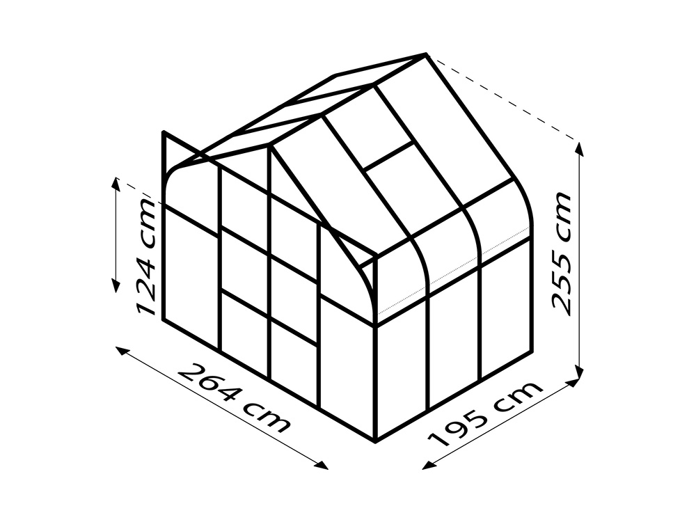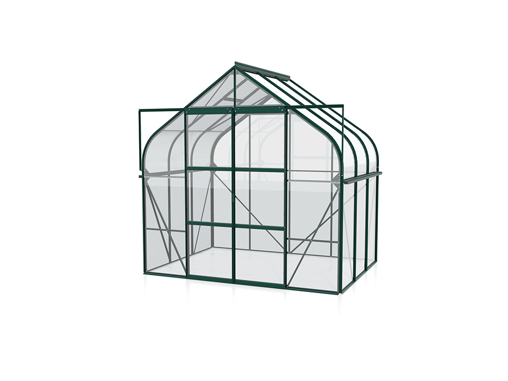 De kas is gemaakt van sterk, groen gepoedercoat aluminium en standaard uitgerust met 3 mm veiligheidsglas voor een stevige constructie en maximale lichtinval. De gebogen randen zijn afgewerkt met UV-bestendige, heldere polycarbonaatplaten. Extra praktische details zijn de geïntegreerde goten en 1 tot 4 dakramen (afhankelijk van de grootte) voor optimale ventilatie.