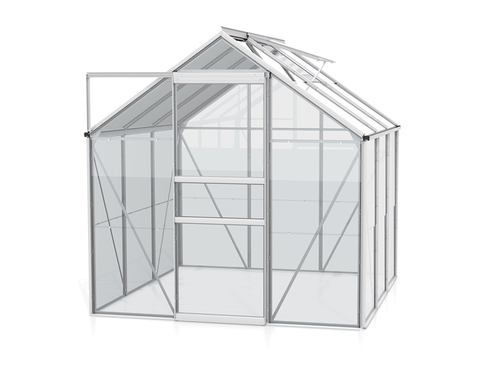 De serre wordt geleverd in duurzaam geanodiseerd aluminium met standaard veiligheidsglas zodat ze er jarenlang als nieuw uitziet. Met een handige schuifdeur die naar keuze links of rechts kan worden geplaatst, biedt de Venus flexibiliteit en gebruiksgemak. Afhankelijk van de grootte heeft de kas één of twee dakramen voor optimale ventilatie, en de structuur is verstevigd met daksteunen.