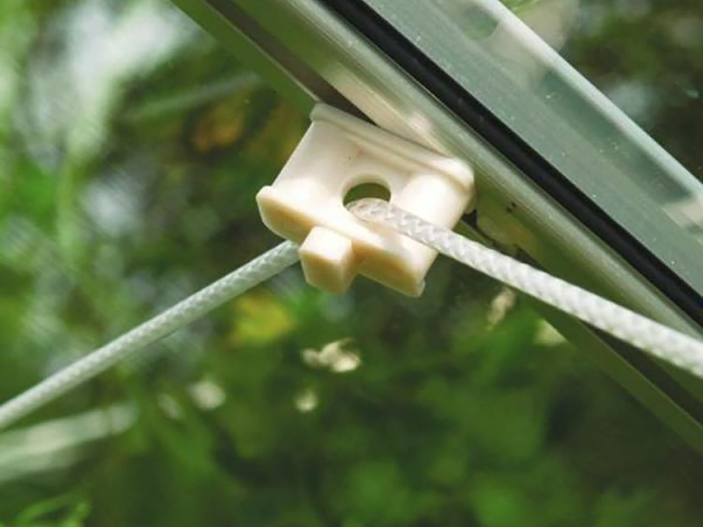 Dankzij de kantelboutkop past de schroefhaak in de gleuf van het serre- of kasprofiel en is het geschikt voor verschillende toepassingen. Zo kan je er bijvoorbeeld eenvoudig de steundraad voor de geleiding van tomaten en andere planten aan bevestigen.