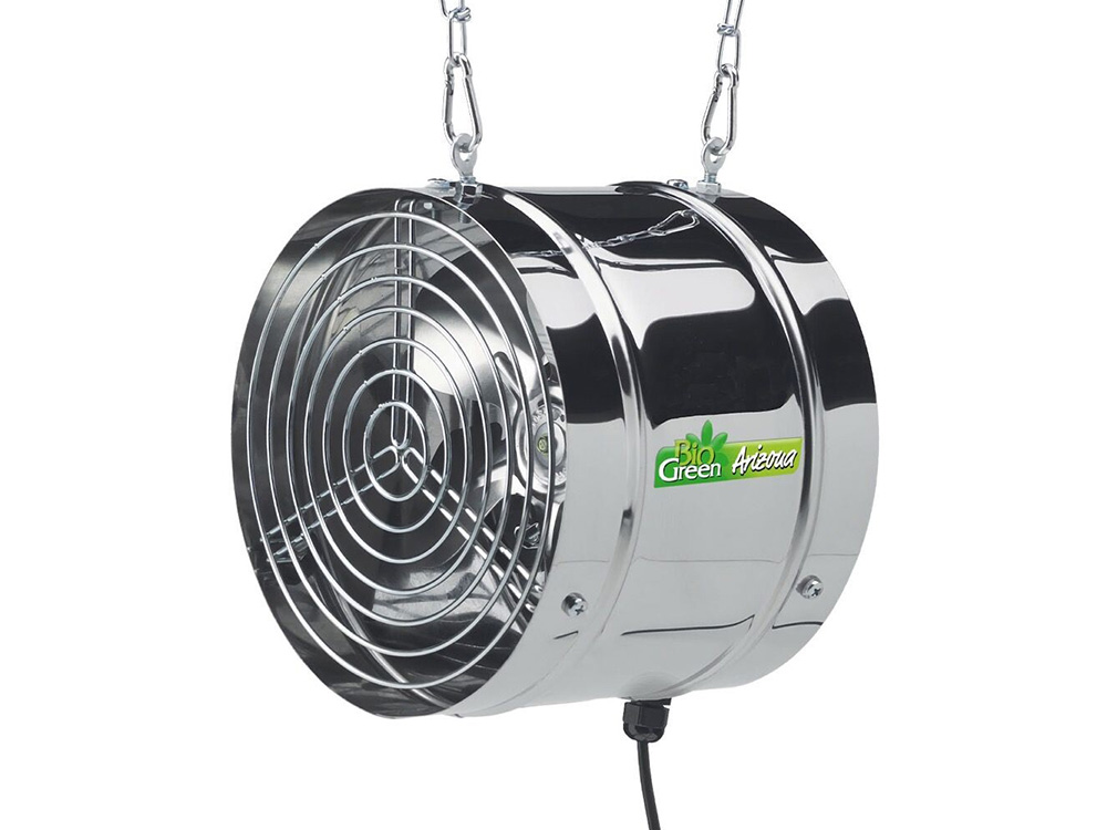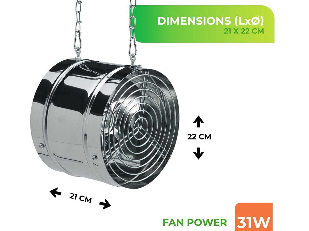 Deze zeer stille ventilator 'Arizona' zorgt voor een maximale luchtcirculatie en verluchting in serre, kas, veranda,...Door de meegeleverde ophangkettingen is de ventilator makkelijk omhoog te hangen waardoor je plaats kan besparen.
