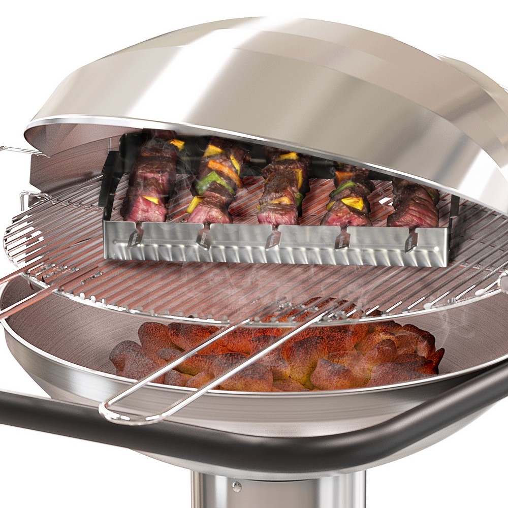 De stevige houder past op de grillplaat van elke barbecue en heeft ruimte voor 5 brochettespiezen.