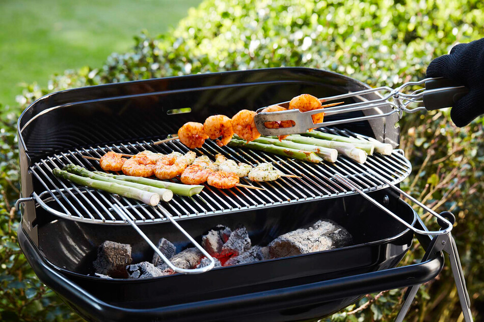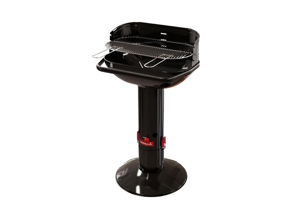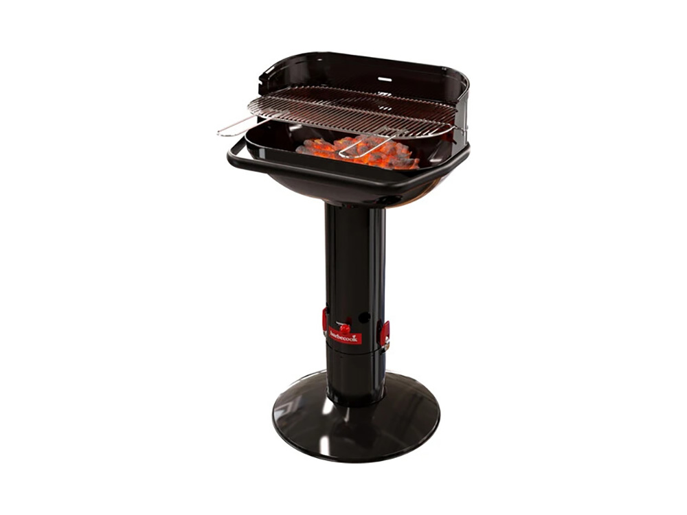 Het verchroomd rooster is verstelbaar in drie posities. Deze uitvoering van Barbecook barbecue Loewy heeft een zwarte look en is gemaakt uit geëmailleerd staal.