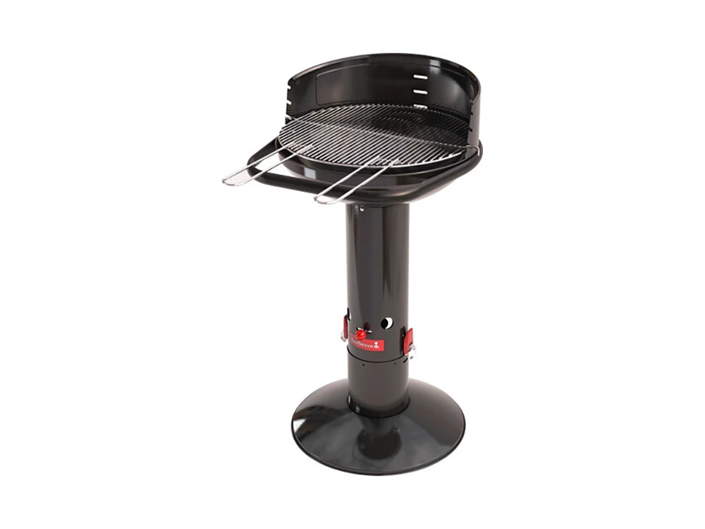 Het verchroomd rooster is verstelbaar in drie posities. Deze uitvoering van Barbecook barbecue Loewy heeft een zwarte look en is gemaakt uit geëmailleerd staal.