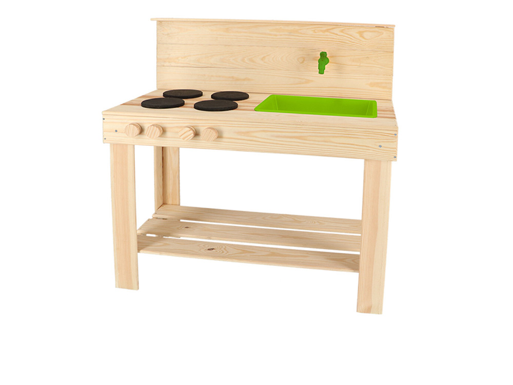Deze keuken, voorzien van een stevige kunststof bak, brengt niet alleen plezier maar stimuleert ook de verbeelding van de kinderen. Het onderste schap biedt ruimte voor het opbergen van speelgoed zoals schepjes, emmer, gieter of de complete [product=3]36546-modderkeuken kookset[/product].