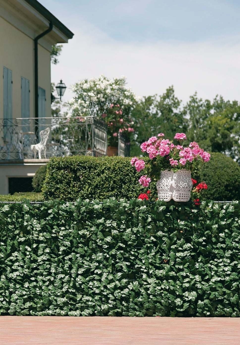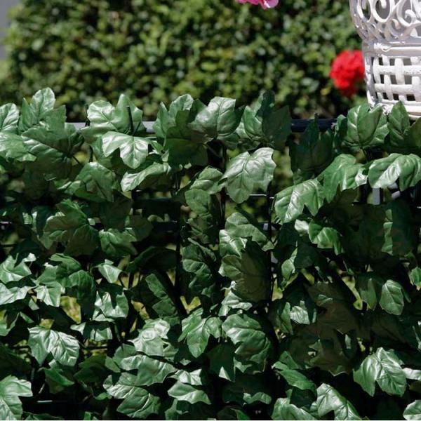 Dit decoratieve scherm bestaat uit een kunststof net in combinatie met kunststof klimopbladeren. Het groene scherm kan gebruikt worden tegen een tuinmuur, aan een ballustrade of om een bepaalde zone van de tuin af te schermen. Eenmaal het groene scherm bevestigd is, ziet het er uit zoals een met klimop begroeide wand.